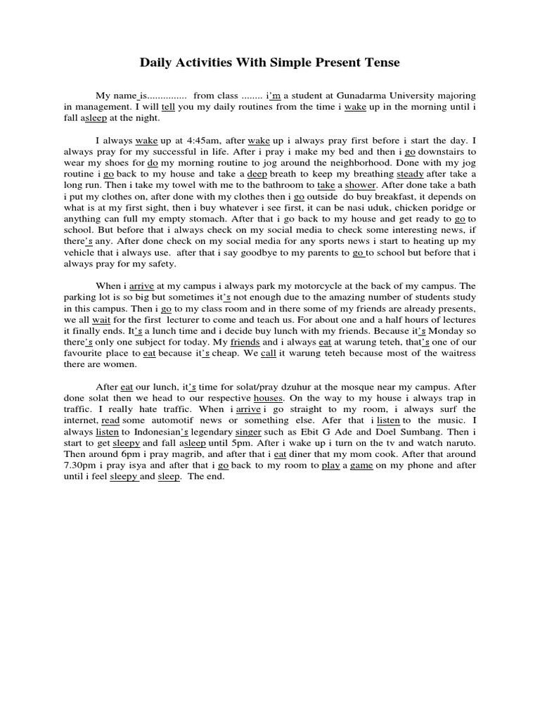Daily Activities With Simple Present Tense My names Zainal Abidin from class 4ea03 im a student at Gunadarma University majoring in management. Contoh Teks Daily Activities Berserta Terjemahannya Halo sobat IBI. TIPS Uncategorized Writing Tagged cerita kegiatan sehari hari pelajar dalam bahasa inggris contoh daily activity dalam bahasa inggris dan terjemahannya contoh kegiatan sehari hari dari bangun tidur sampai.