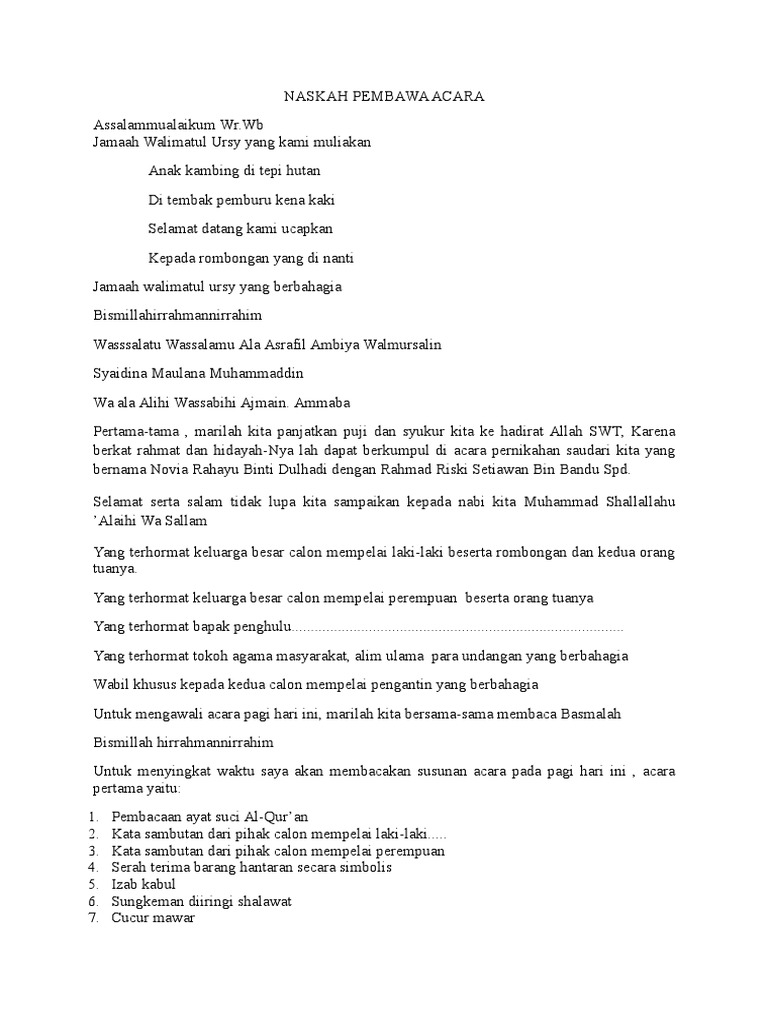 Kali ini mau nge share teks mc buat walimahan syukuran mantenandulu pernah diminta untuk jadi pembawa acara buat nikahan ponakaneh sekarang nemu catetan dulu pas itujadi mmpung nemu disimpen dulu dimarimbok siapa tau ada yang butuhjuga buat arsip. MC walimatul ursy yang harus kamu pilih sebisa mungkin harus orang yang sudah terbiasa menghilang acara tersebut.